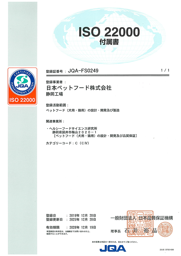 私たちは安全安心なペットフードを届けるために原材料の品質確認、製造工程内での品質チェック、製造機器の保守点検を確実に行っています。静岡工場は、国際規格であるISO22000(食品安全マネジメントシステム)の認証を取得、食品と同等の安全性管理に努めています。