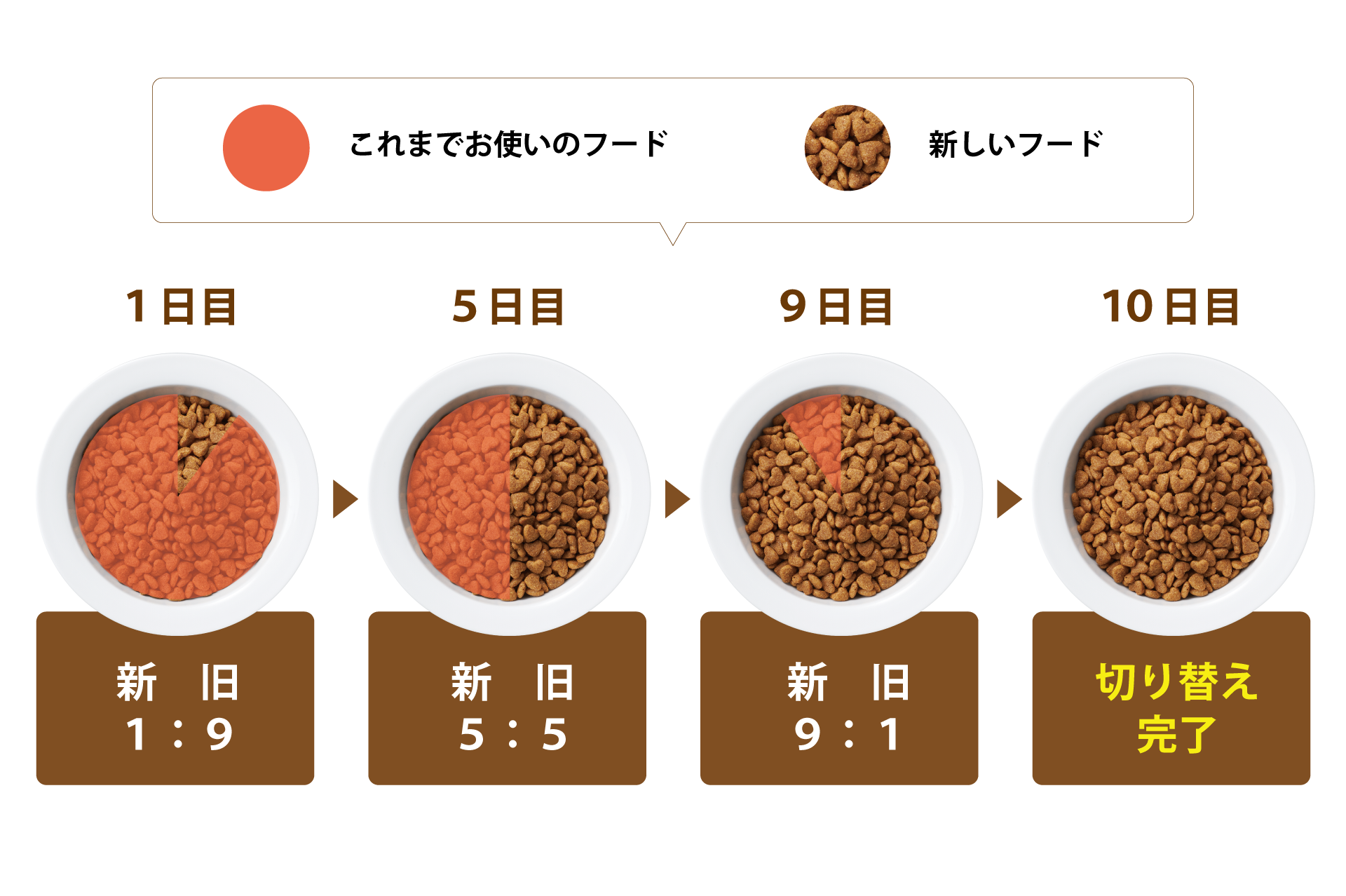 切り替える際にはフードの割合を新:旧=1:9から始め、10日程度かけて少しずつ増やしていきましょう。