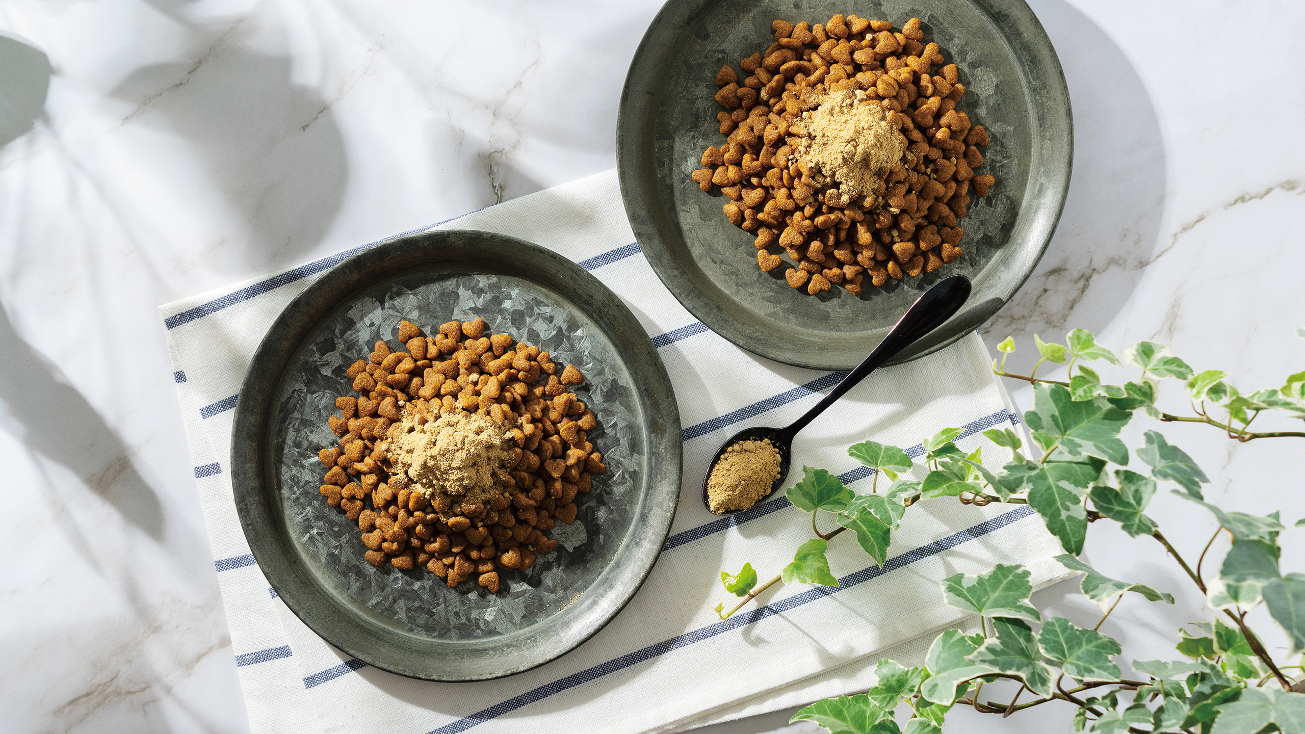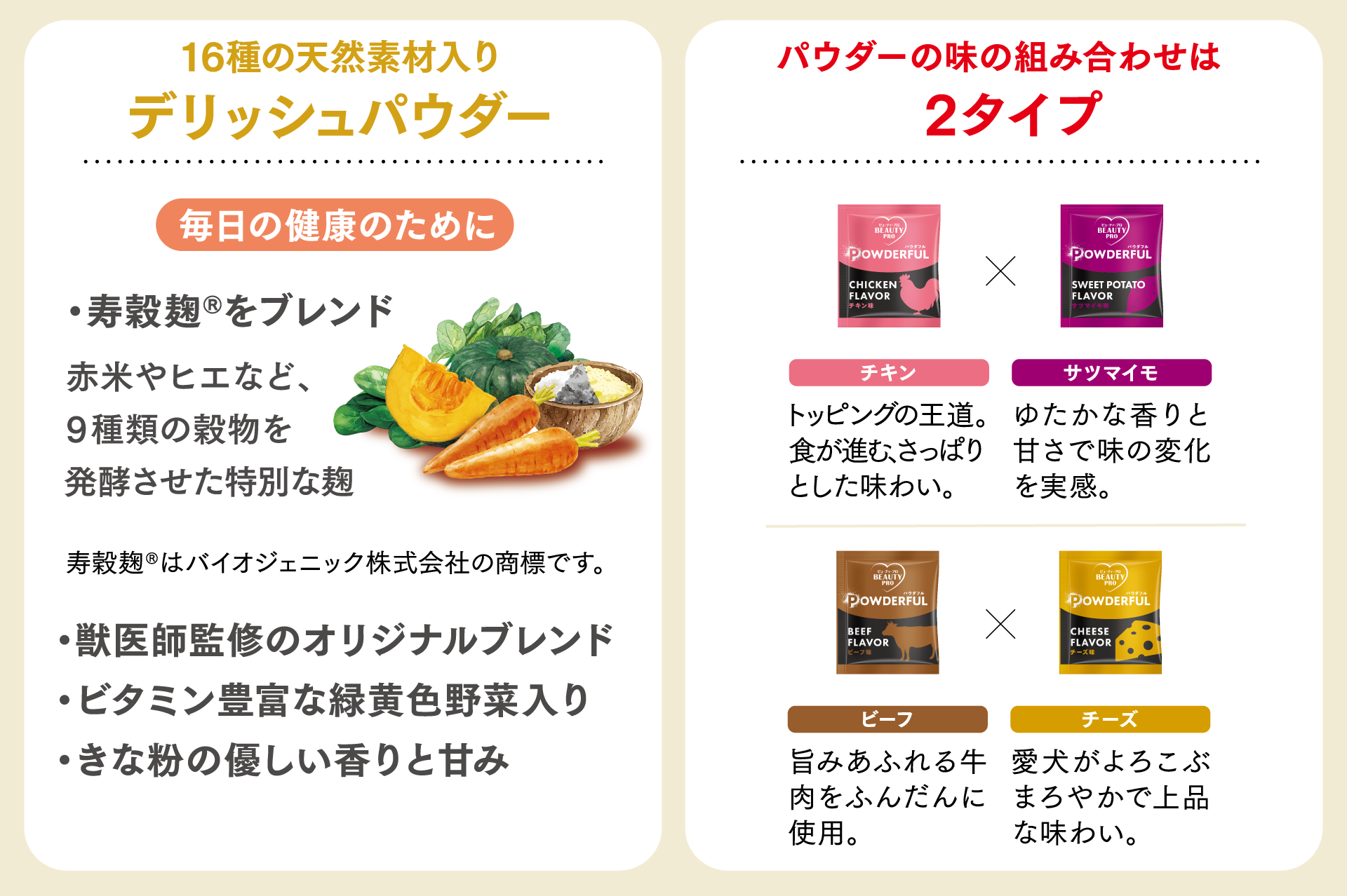 寿穀麹®をブレンドし、ビタミン豊富な緑黄色野菜やきな粉の甘みを引き立たせたパウダーがおいしさのポイント。ドライフードとの味・栄養バランスを考えたこだわり設計で、安心とおいしさを両立しています。