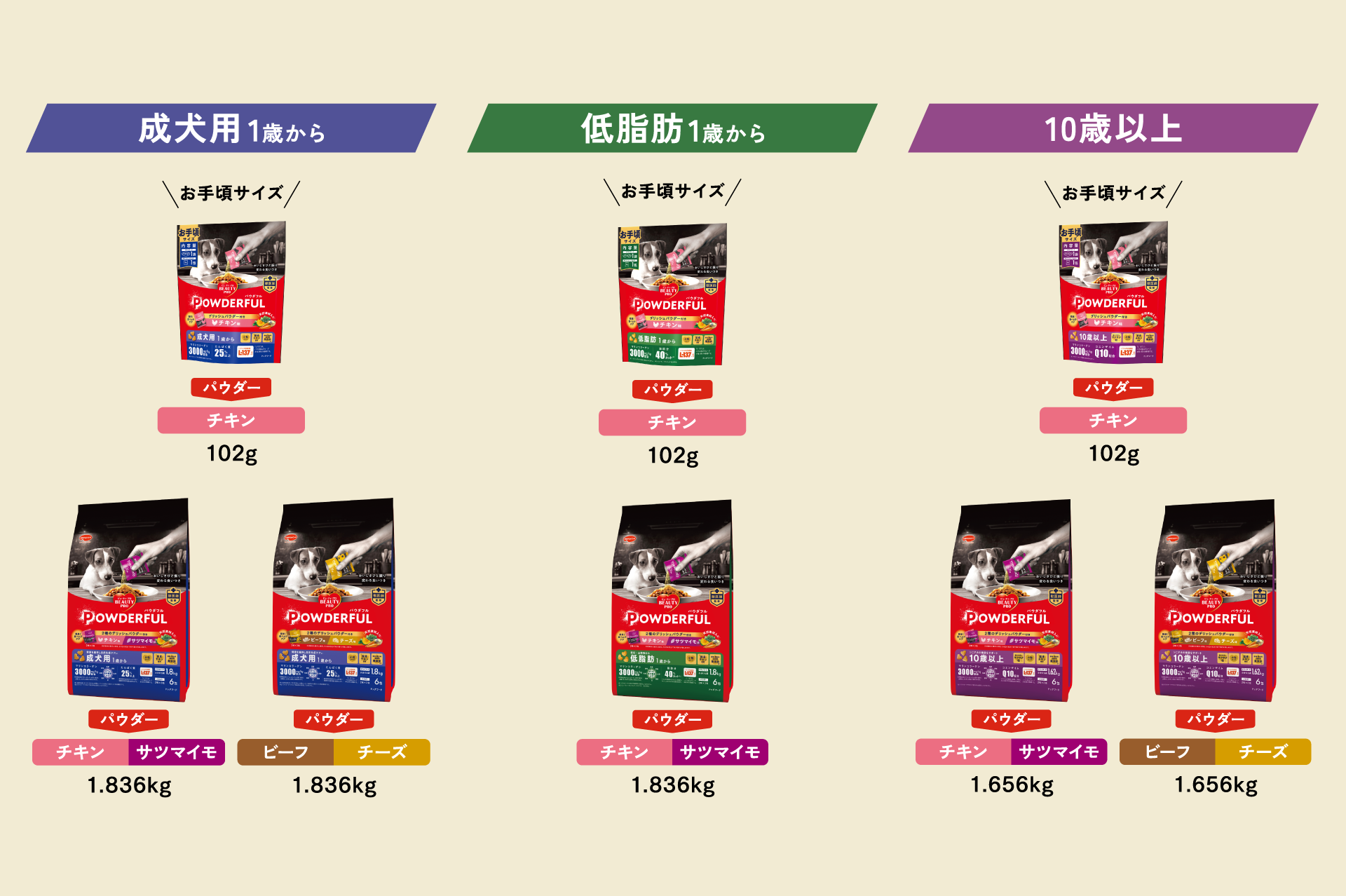 パウダーの味は全部で4種類(チキン味×サツマイモ味、ビーフ味×チーズ味)。商品によって組み合わせを変え、選べる楽しさをご提供しています。手軽に味変できるのがポイントです。