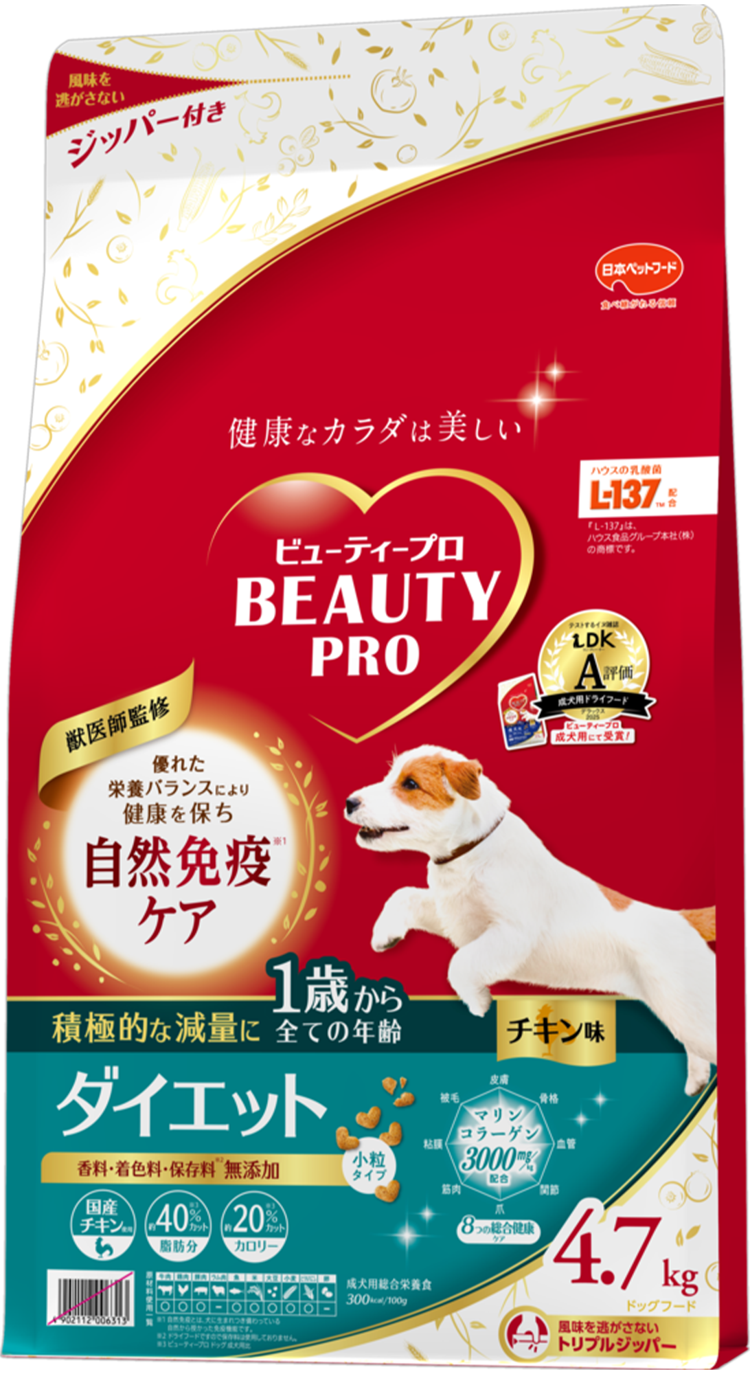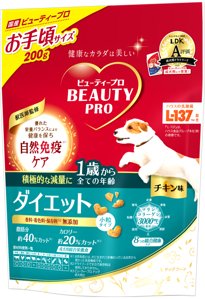 たんぱく質量とおいしさを維持したまま、脂肪分約40%・カロリー約20%カット(成犬用比)