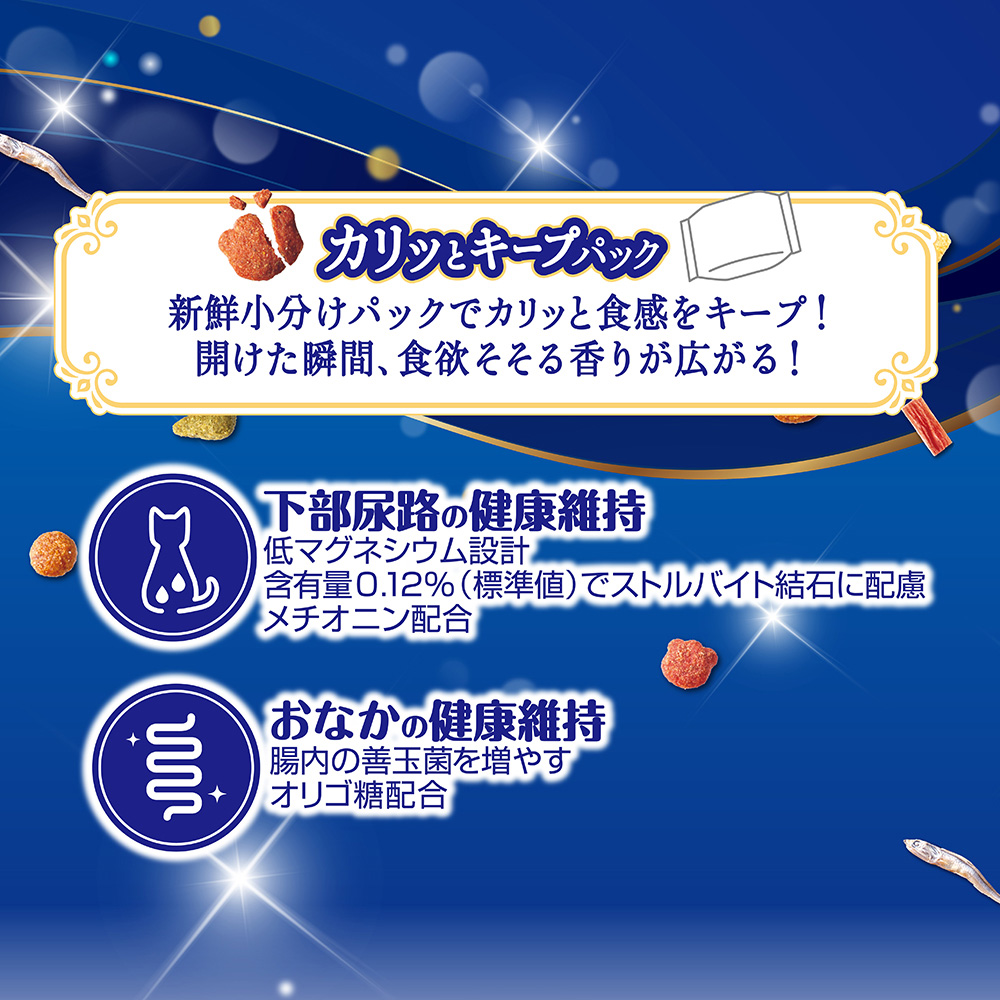 穀類(トウモロコシ、コーングルテンミール、小麦粉、パン粉)、肉類(チキンミール、牛肉粉、豚肉粉)、魚介類(フィッシュミール、カツオ加工品(熟成カツオ)、フィッシュパウダー、マグロエキス、小魚粉末、カツオ節粉、カツオエキス、シラスパウダー)、油脂類(動物性油脂、植物性油脂)、脱脂大豆、オリゴ糖、ハーブ(タイム、ディル、フェンネル)、野菜類(トマト、ニンジン、ホウレンソウ)、クランベリーパウダー、ミネラル類(カルシウム、リン、カリウム、ナトリウム、クロライド、鉄、銅、マンガン、亜鉛、ヨウ素、コバルト)、pH調整剤、アミノ酸類(タウリン、トリプトファン、メチオニン、リジン)、ビタミン類(A、B1、B2、B6、B12、D、E、K、ニコチン酸、パントテン酸、ビオチン、葉酸、コリン、アスコルビン酸カルシウム)、酵母細胞壁、着色料(二酸化チタン、食用赤色102号、食用赤色106号、食用黄色4号、食用黄色5号、食用青色1号)、酸化防止剤(ミックストコフェロール、ローズマリー抽出物、ハーブ抽出物)、グルコサミン、コンドロイチン