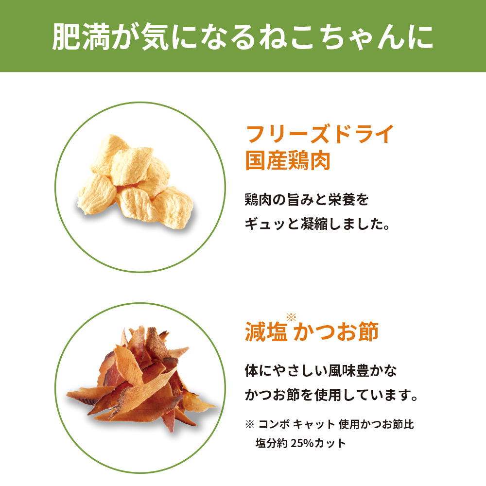 • 素材そのまま、栄養も損なわれない国産鶏肉フリーズドライと体にやさしい減塩かつお節の本物にこだわり抜いたトッピング。(コンボキャット使用のかつお節比 塩分約25%カット)