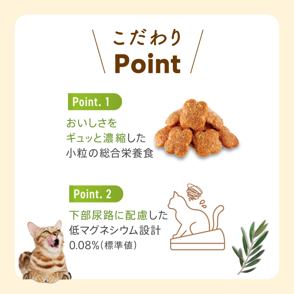 • 下部尿路の健康維持に配慮した、低マグネシウム設計。(含有量0.08%:標準値)