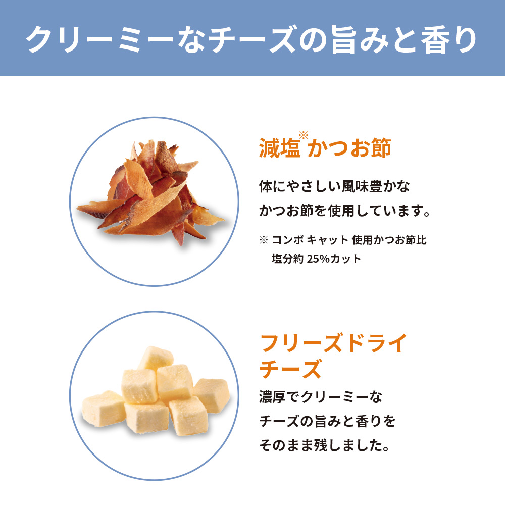 • 素材そのまま、栄養も損なわれないフリーズドライチーズと体にやさしい減塩かつお節の本物にこだわり抜いたトッピング。(コンボキャット使用のかつお節比 塩分約25%カット)