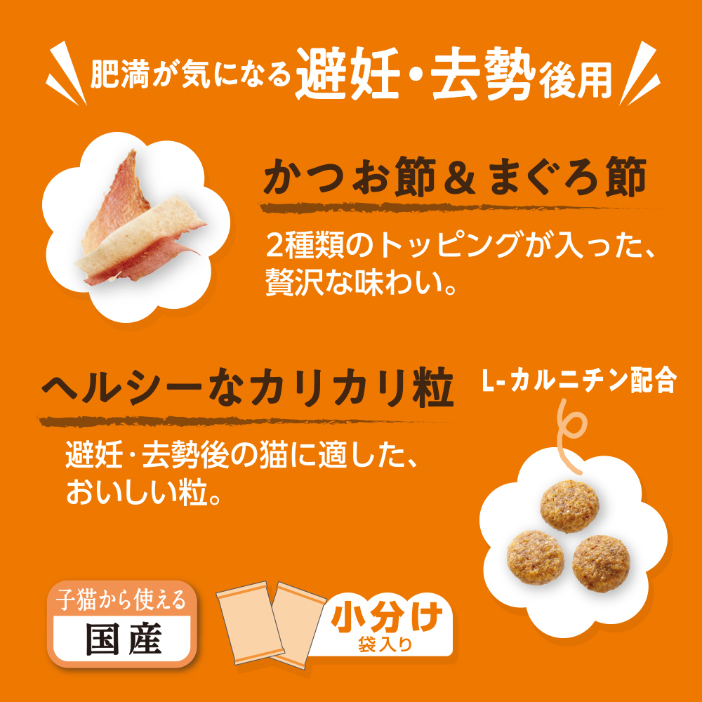 穀類(トウモロコシ、コーングルテンミール、小麦粉、パン粉)、肉類(チキンミール、牛肉粉、豚肉粉)、魚介類(フィッシュミール、フィッシュパウダー、カツオブシ、マグロブシ、マリンコラーゲン)、油脂類(動物性油脂、植物性油脂)、脱脂大豆、L-カルニチン、ビール酵母(β-グルカン源)、オリゴ糖、ミネラル類(カルシウム、リン、カリウム、ナトリウム、クロライド、銅、亜鉛、ヨウ素)、pH調整剤、アミノ酸類(タウリン、トリプトファン、メチオニン)、ビタミン類(A、B1、B2、B6、B12、D、E、K、ニコチン酸、パントテン酸、葉酸、コリン)、N-アセチルグルコサミン、コンドロイチン、酸化防止剤(ミックストコフェロール、ローズマリー抽出物)
