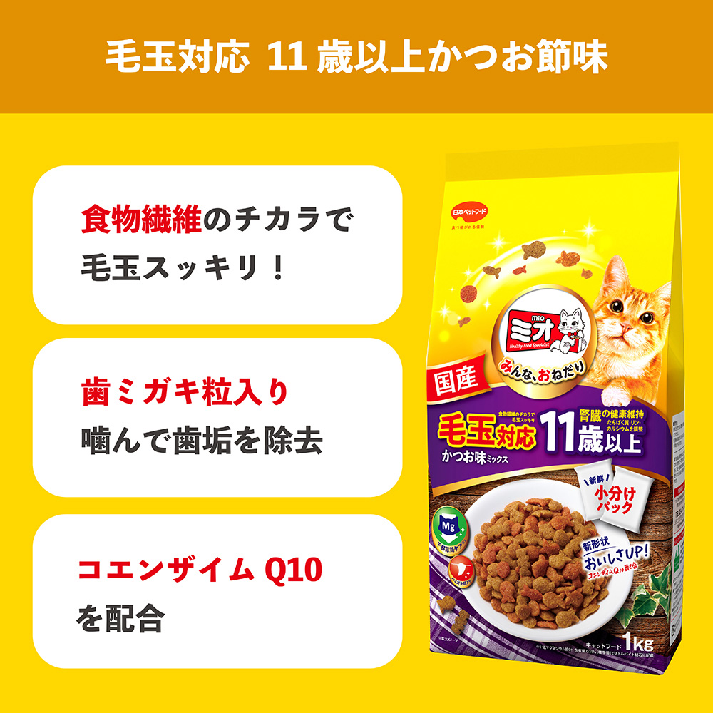 穀類(トウモロコシ、コーングルテンミール、小麦粉、パン粉)、肉類(チキンミール、牛肉粉、豚肉粉)、動物性油脂、魚介類(フィッシュパウダー、カツオ粉末、マグロ節粉、小魚粉末)、脱脂大豆、コエンザイムQ10、オリゴ糖、野菜類(トマト、ニンジン、ホウレンソウ)、クランベリーパウダー、セルロース(食物繊維)、ミネラル類(カルシウム、リン、カリウム、ナトリウム、クロライド、鉄、銅、マンガン、亜鉛、ヨウ素、コバルト)、アミノ酸類(タウリン、メチオニン、リジン)、ビタミン類(A、B1、B2、B6、B12、D、E、K、ニコチン酸、パントテン酸、ビオチン、葉酸、コリン、アスコルビン酸カルシウム)、着色料(食用赤色102号、食用赤色106号、食用黄色4号、食用黄色5号)、酸化防止剤(ミックストコフェロール、ローズマリー抽出物、ハーブ抽出物)、グルコサミン、コンドロイチン