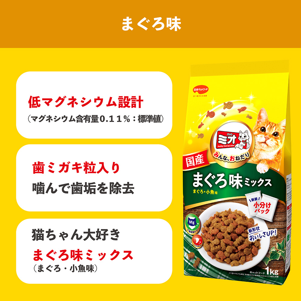 穀類(トウモロコシ、コーングルテンミール、小麦粉、パン粉)、肉類(チキンミール、牛肉粉、豚肉粉)、動物性油脂、魚介類(フィッシュパウダー、マグロ節粉、カツオ粉末、小魚粉末)、脱脂大豆、オリゴ糖、野菜類(トマト、ニンジン、ホウレンソウ)、クランベリーパウダー、ミネラル類(カルシウム、リン、カリウム、ナトリウム、クロライド、鉄、銅、マンガン、亜鉛、ヨウ素、コバルト)、アミノ酸類(タウリン、メチオニン、リジン)、ビタミン類(A、B1、B2、B6、B12、D、E、K、ニコチン酸、パントテン酸、ビオチン、葉酸、コリン、アスコルビン酸カルシウム)、着色料(食用赤色102号、食用赤色106号、食用黄色4号)、酸化防止剤(ミックストコフェロール、ローズマリー抽出物、ハーブ抽出物)、グルコサミン、コンドロイチン