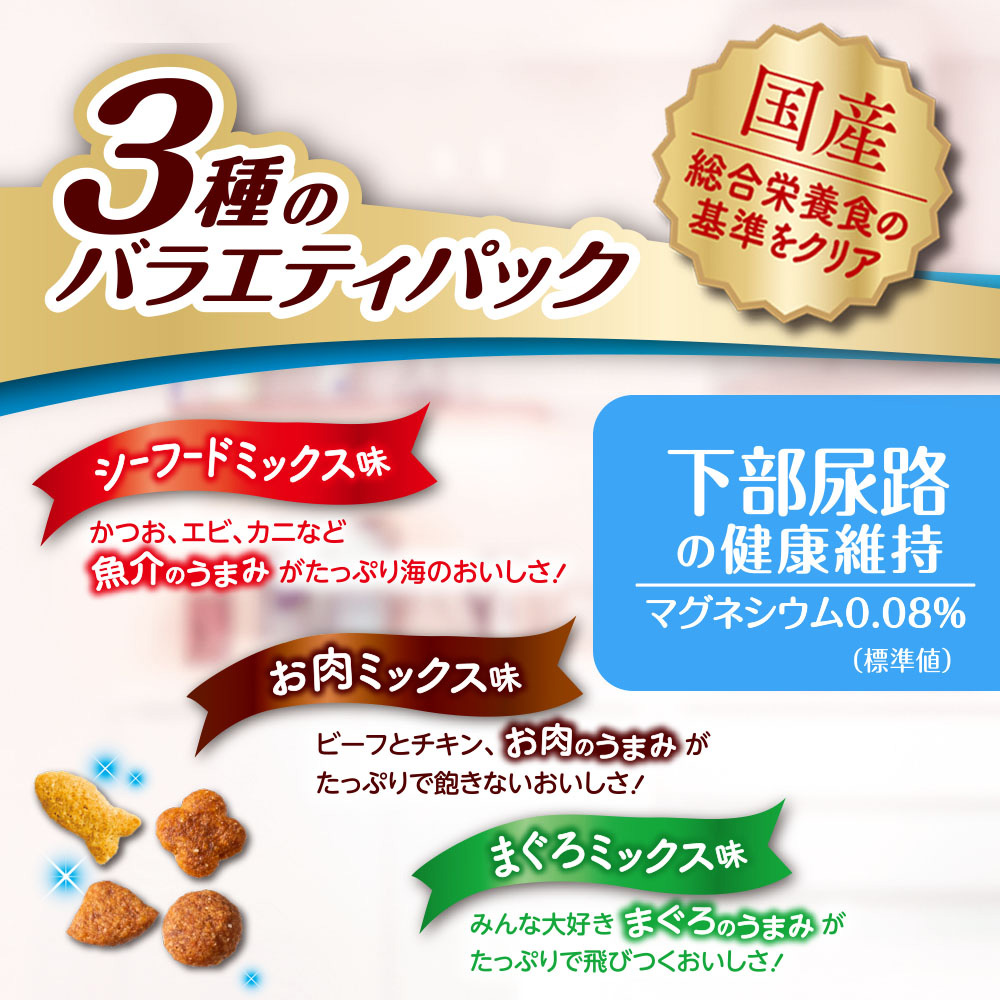 • シーフードミックス味、お肉ミックス味、まぐろミックス味の3種バラエティパック。