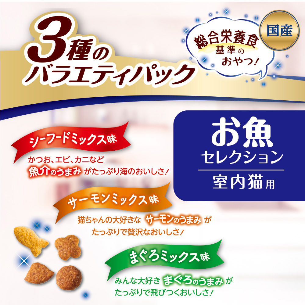 • シーフードミックス味、サーモンミックス味、まぐろミックス味のお魚をセレクトした3種バラエティパック。
