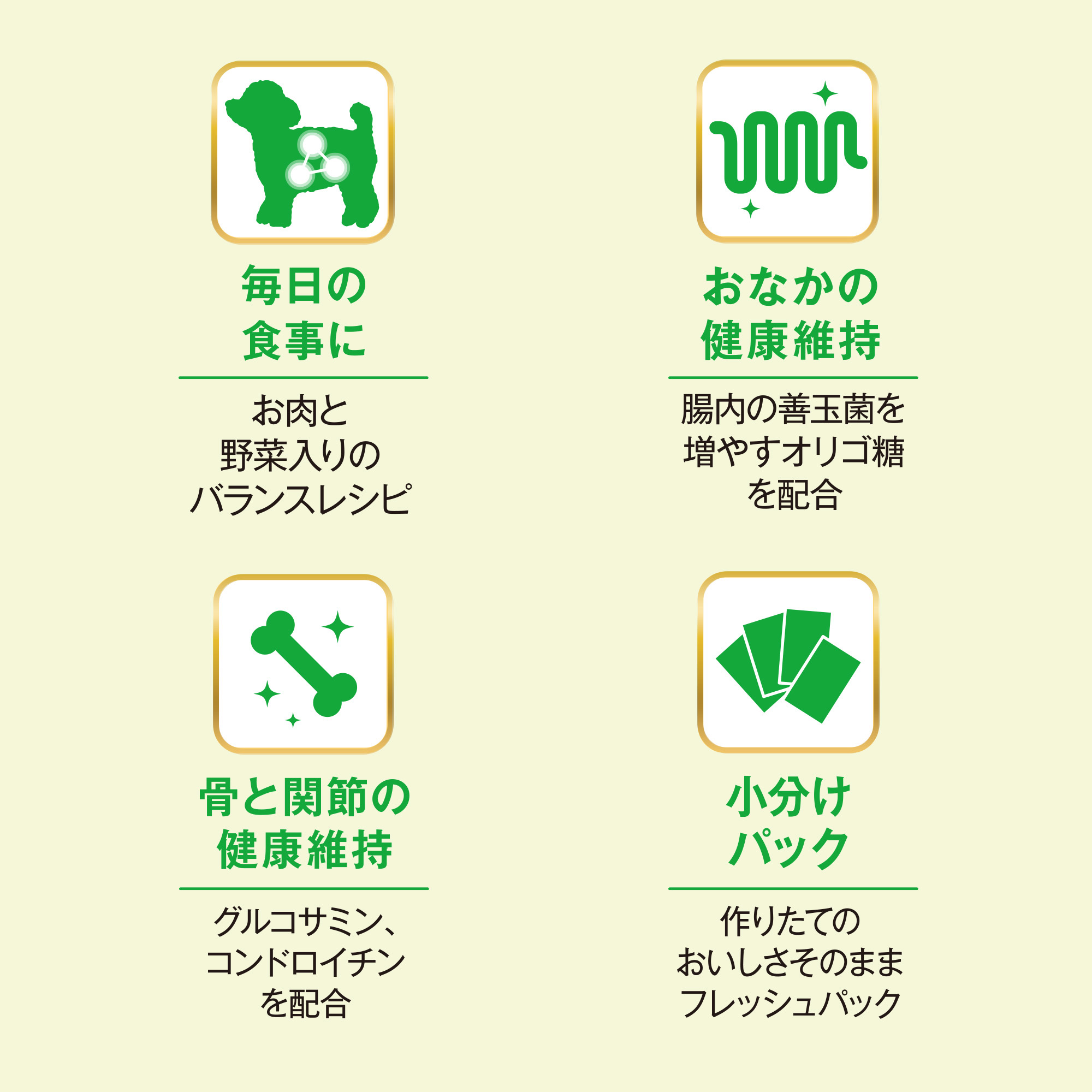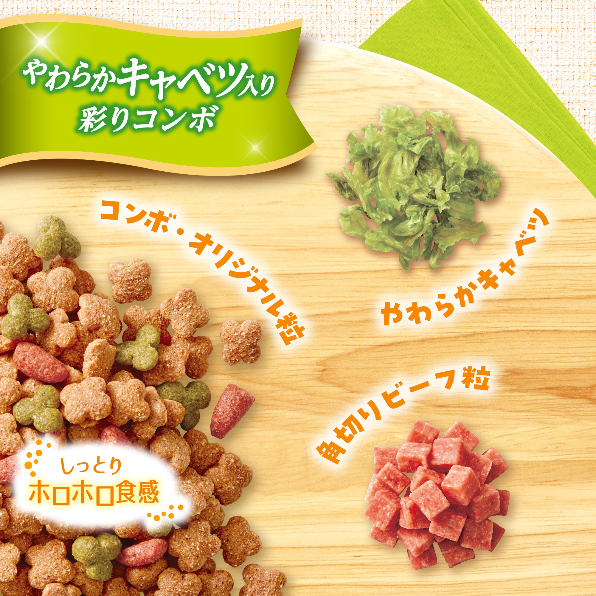 穀類(トウモロコシ、小麦粉、脱脂米糠、コーングルテンフィード、小麦タンパク)、肉類(チキンミール、チキン、牛肉粉、豚肉粉、チキンレバーパウダー、ビーフ)、脱脂大豆、油脂類(動物性油脂、植物性油脂(オメガ-6脂肪酸含む))、野菜類(キャベツ、大麦若葉、カボチャ、トマト、ニンジン、ブロッコリー、ホウレンソウ、モロヘイヤ)、でん粉分解物、ビール酵母、食塩、セレン酵母、小魚粉末、オリゴ糖、カゼインホスホペプチド、プロピレングリコール、ミネラル類(カルシウム、リン、ナトリウム、クロライド、鉄、銅、マンガン、亜鉛、ヨウ素、コバルト)、グリセリン、pH調整剤、保存料(ソルビン酸カリウム、デヒドロ酢酸ナトリウム)、ソルビトール、ビタミン類(A、B2、B6、B12、D、E、パントテン酸、コリン)、膨張剤、酸化防止剤(エリソルビン酸ナトリウム、ミックストコフェロール、ローズマリー抽出物)、着色料(二酸化チタン、食用赤色102号、食用赤色106号、食用黄色4号、食用黄色5号、食用青色1号)、グルコサミン、アミノ酸類(アルギニン、メチオニン)、コンドロイチン
