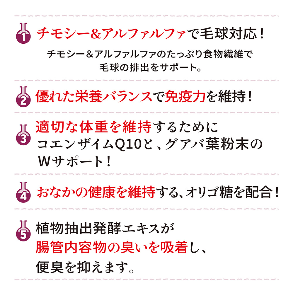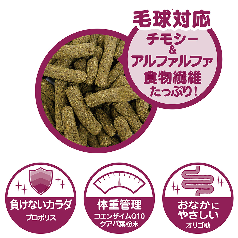 チモシー、アルファルファミール、小麦粉、脱脂大豆、タピオカでん粉、ビール酵母、グアバ葉粉末、植物抽出発酵エキス、オリゴ糖、プロポリスエキス、コエンザイムQ10、ミネラル類(カルシウム、リン、ナトリウム、クロライド、銅、亜鉛、ヨウ素)、甘味料(ステビア抽出物)、アミノ酸類(メチオニン)、ビタミン類(A、B1、B2、B6、B12、D、E、K、ナイアシン、パントテン酸、ビオチン、葉酸、コリン、C、イノシトール)