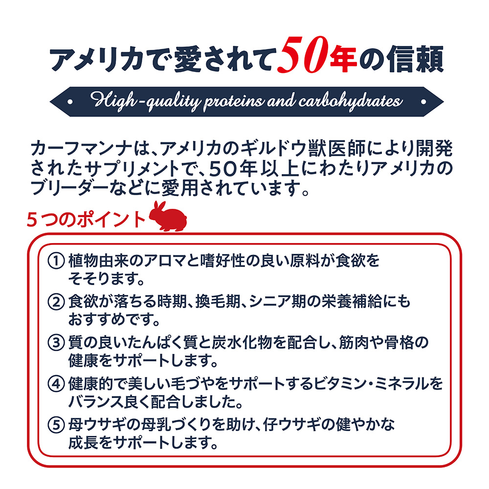 50年以上にわたりアメリカのブリーダーやショーラビット愛好家に愛用されているサプリメントです。