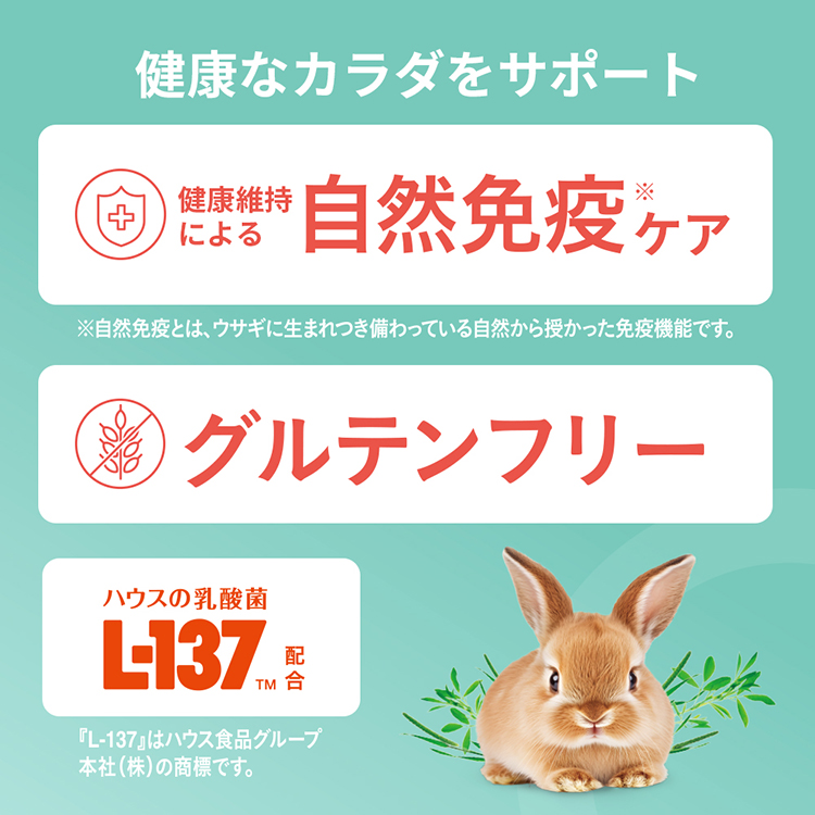ハウスの乳酸菌『L-137』配合でウサギの健やかな毎日をサポート。(『L-137』はハウス食品グループ本社(株)の商標です。)