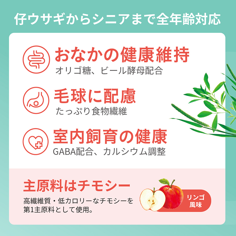 主原料にチモシーを使用。りんご風味で飽きないおいしさ!